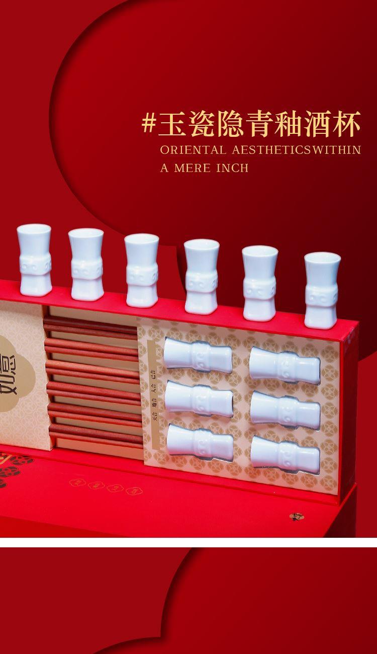 青錦大宴系列【四合如意】禮盒紅檀木筷6雙玉瓷隱青釉酒杯6只 青錦大宴系列【四合如意】禮盒紅檀木筷6雙玉瓷隱青釉酒杯6只