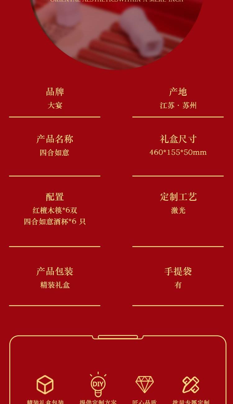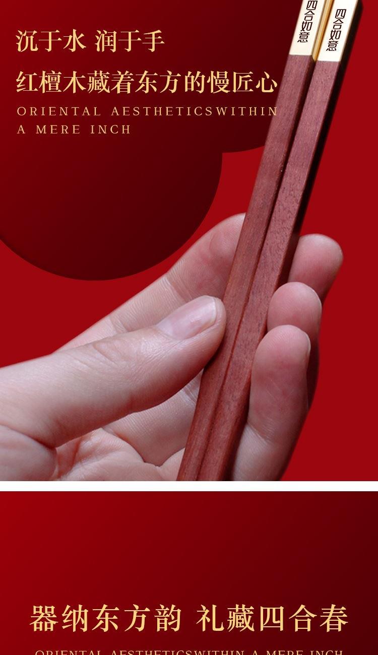 紅檀木筷x6雙;四合如意酒杯x6 只 材質(zhì) 羊脂玉影青釉 紅檀木純銅鍍金筷頭 尺寸 包裝尺寸:460*155*50mm 紅檀木筷:250*7*7mm 酒杯:55*28mm 推薦理由: ? 新婚賀禮: "紅檀成雙,金箸挑喜" ? 商務(wù)贈(zèng)禮: "箸福同享,金運(yùn)長(zhǎng)存" ? 長(zhǎng)輩壽禮: "檀香伴百歲,金箸添福壽“